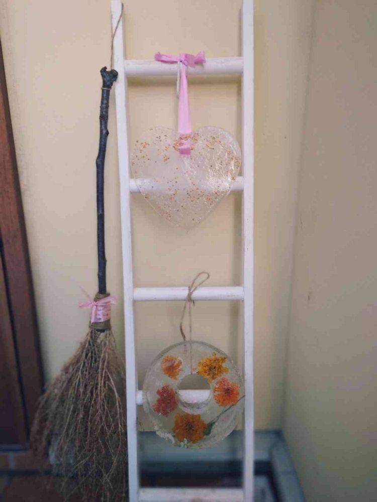 娘が作ったラメ入りハートの氷と、マリーゴールドの氷のリースです。
