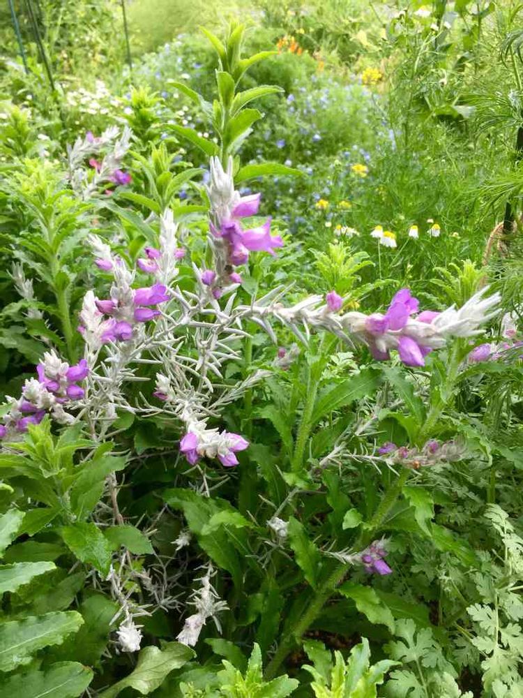 このパープルの花が咲くシルバープランツの名前、何でしたっけ?