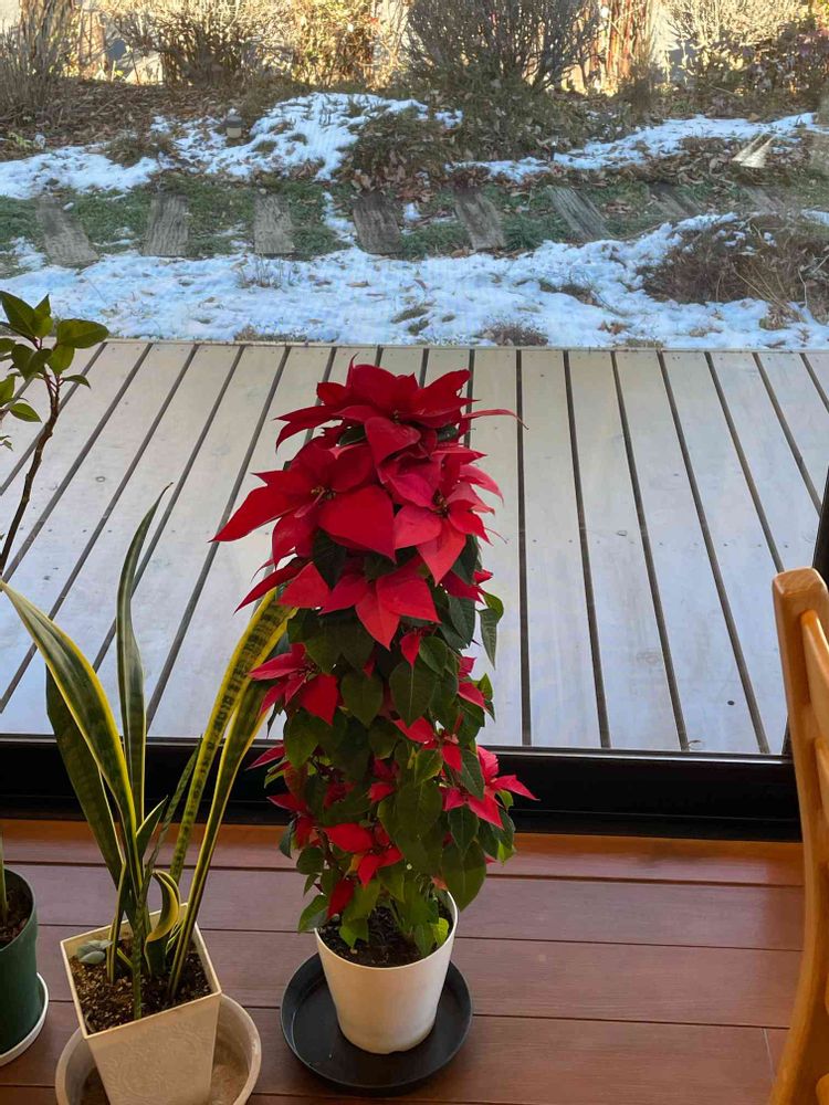 座ってて左に目を👀向けると縦長に仕立てたポインセチア❤️とサンスベリア💚が😆