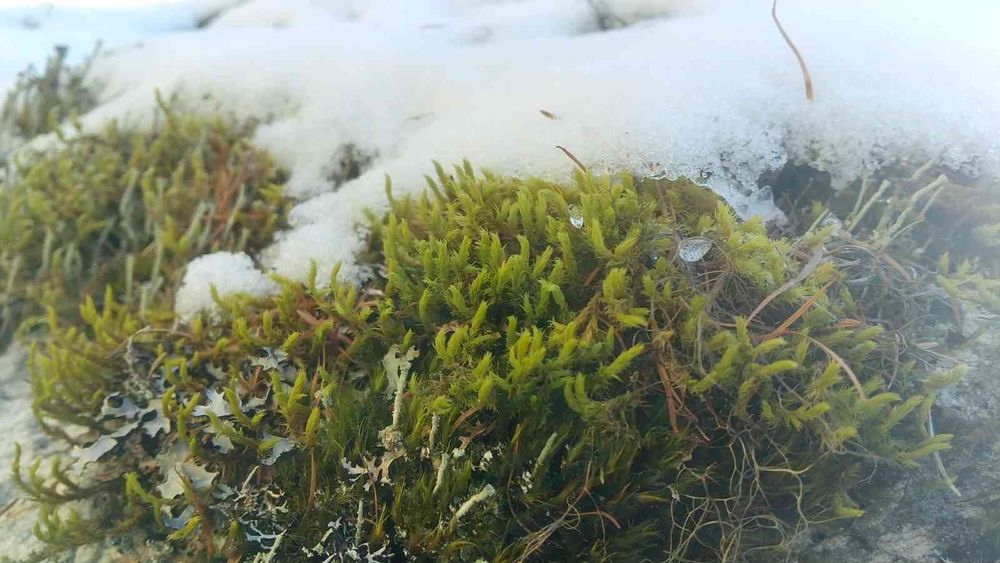 確かに日照の明るい岩の上でした。湿潤時は、黄色みを帯びると言いますが、薄く雪を被っていたエリアなので、ヒジキゴケという推測もなるほどです🤗。ヘートヴィヒア・キリアタ。属名は蘚苔類研究家のJohann Hedwigによる、と図鑑に書いてありました。
