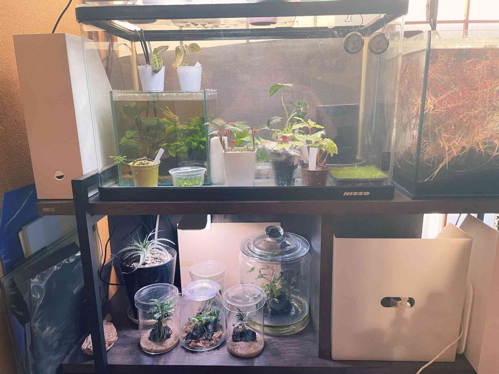 アクアリウムから上陸系。ジメジメ好き。熱帯雨林植物、苔、水草、着生蘭、その他諸々。植物全般広く浅く色々。