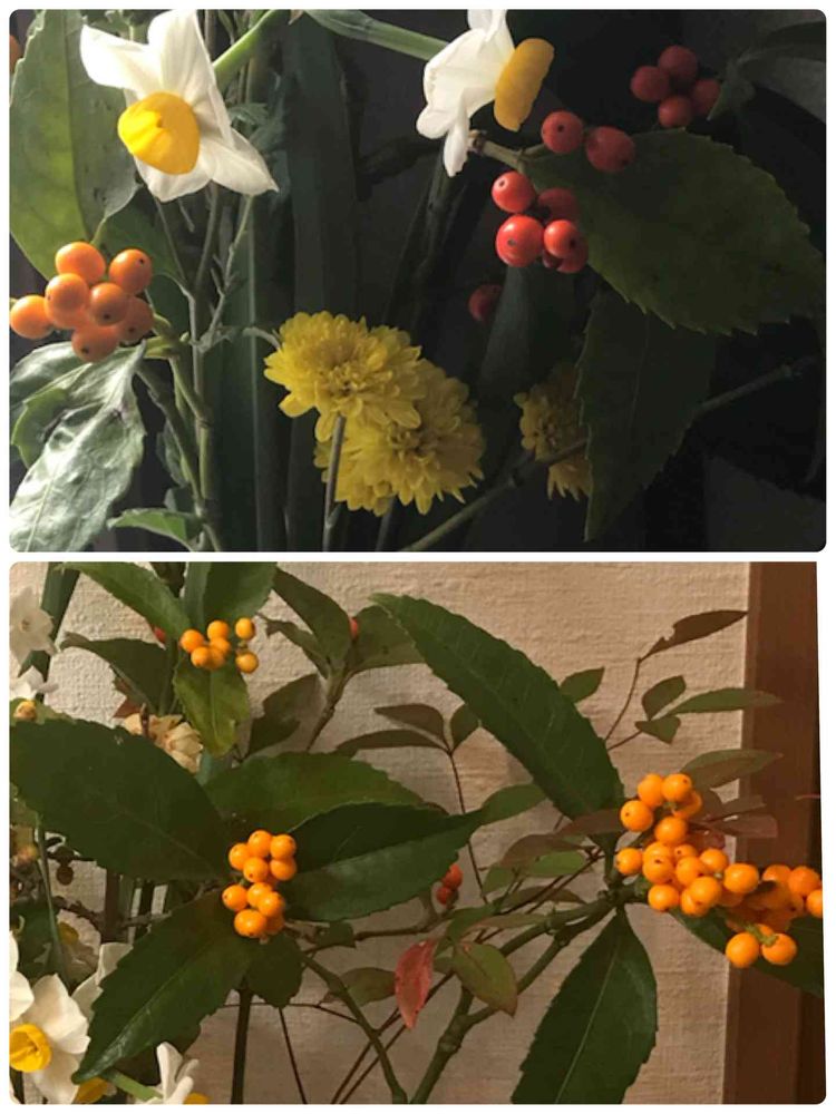 正月のお花用として,庭に赤い実と白い実の千両を植えています。