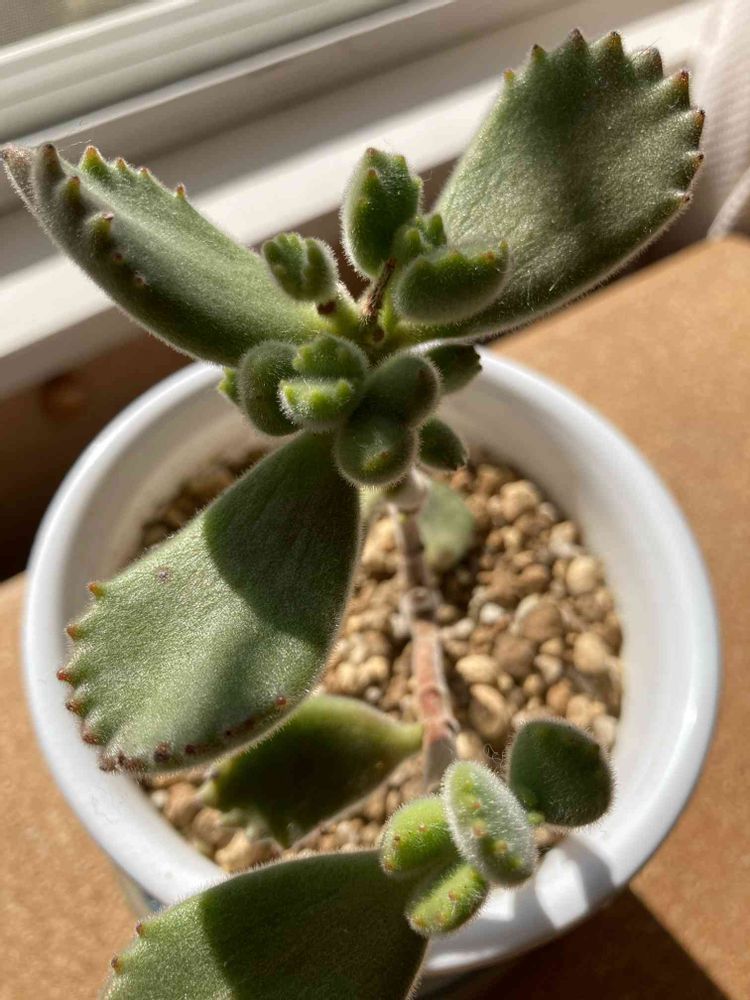 2階の窓辺でぬくぬくしてる熊童子君🧸葉っぱがデカくなった気がします。もっと枝分れしてほしいけど、どうすればいいのかわかりません😅
