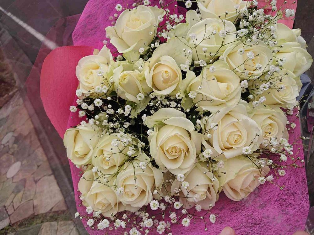 こんばんは♪白バラのブーケ💐すてきですね。娘さん、成人式おめでとう㊗️🎉ございます。ぴったりの花ですね。^o^。