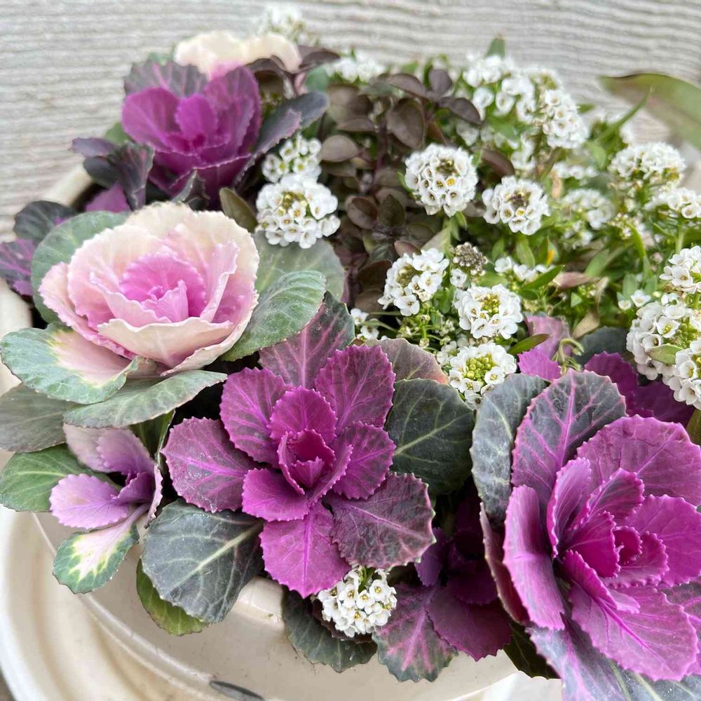 ハボタンブーケをバラして、アリッサムとオレガノを合わせて寄せ植えを作りました。