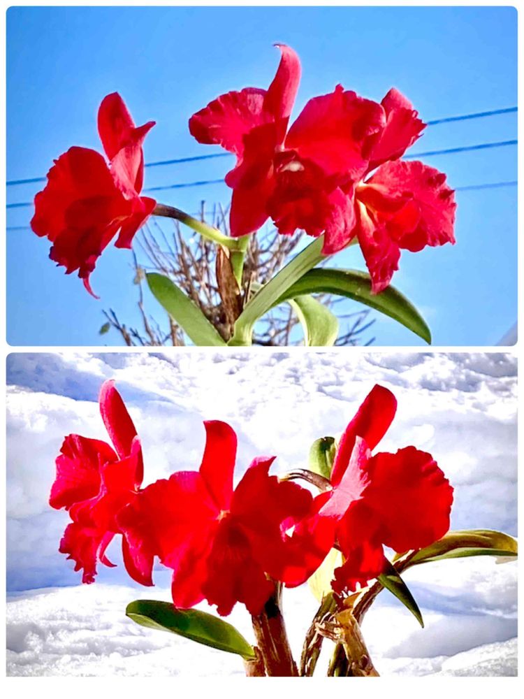 真っ赤なカトレアと、真っ青な空と、真っ白な雪、綺麗ですね~😍