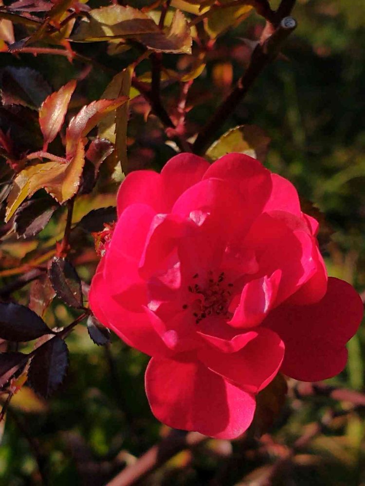 道路脇の植栽に ポツンと真っ赤な薔薇が〜