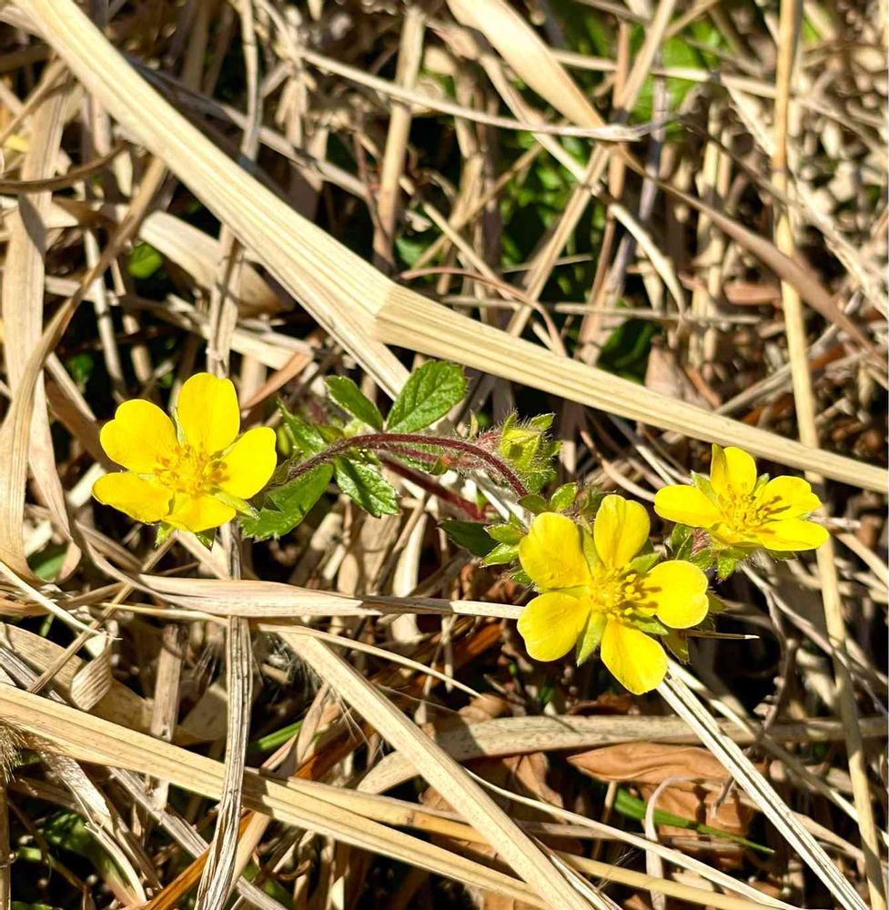 枯れ草の中から顔を出しているのは、キジムシロの三姉妹です。
