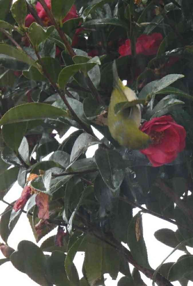 花弁を食べて散らしてしまうヒヨドリと比べると、花に優しいメジロです。