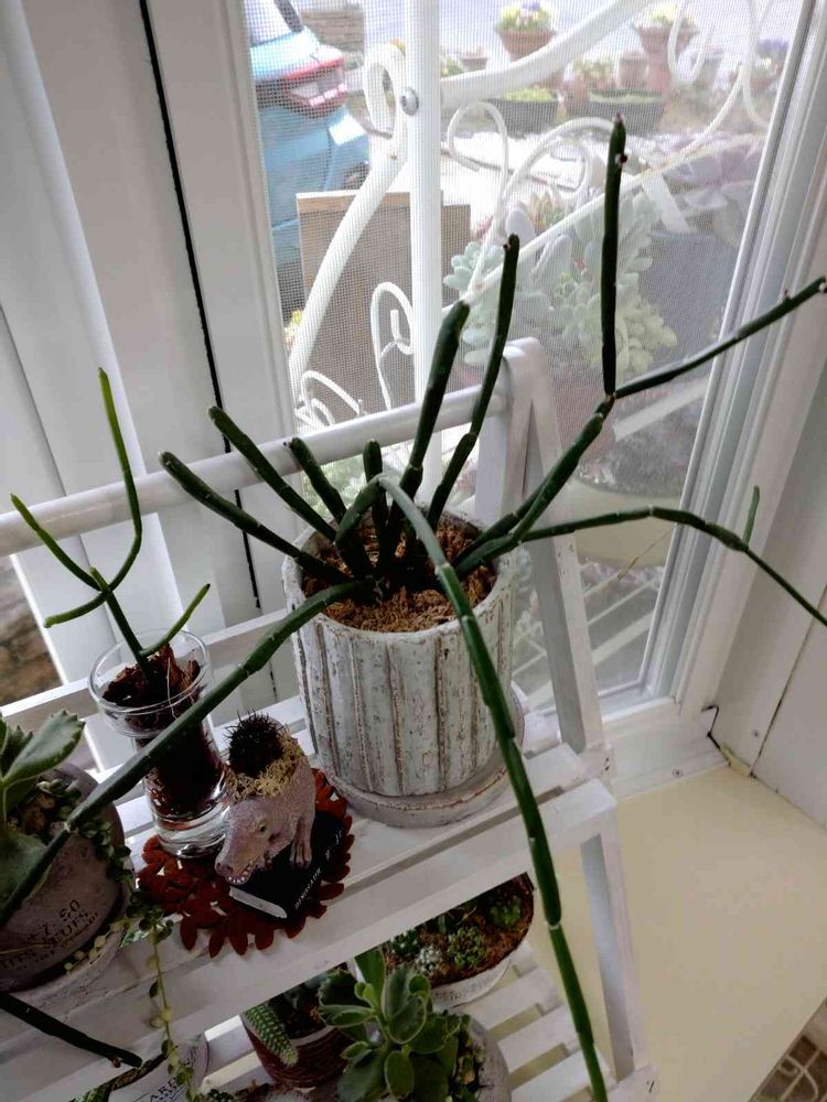 リプサリスは5種類くらいいるけど、こんなナナフシみたいなリプサリスにどんな花が咲くのか?梅の花みたいな蕾のつき方だな?🤔