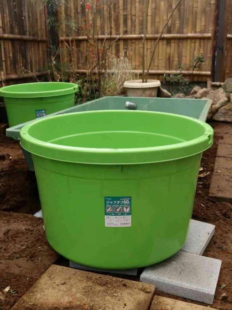 容器の見た目加工は燻したタイプの簾巻き付けるとか、杉板焼いてコゲ落とししたのを加工して周りに巻き付けすれば、きっぺぇさん家の庭にも合いそう♪