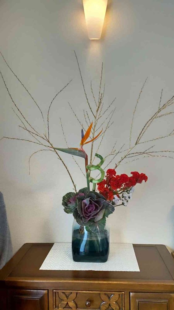 写メを見ていて…お正月花作品その2ですが…金色の枝とかストレリチア極楽鳥花がいろいろ動いて何枚か写メ撮ったのですが…投稿した写メよりこの写メのほうが良く思えてきて…(笑)備忘録として投稿させてください😅💦💦