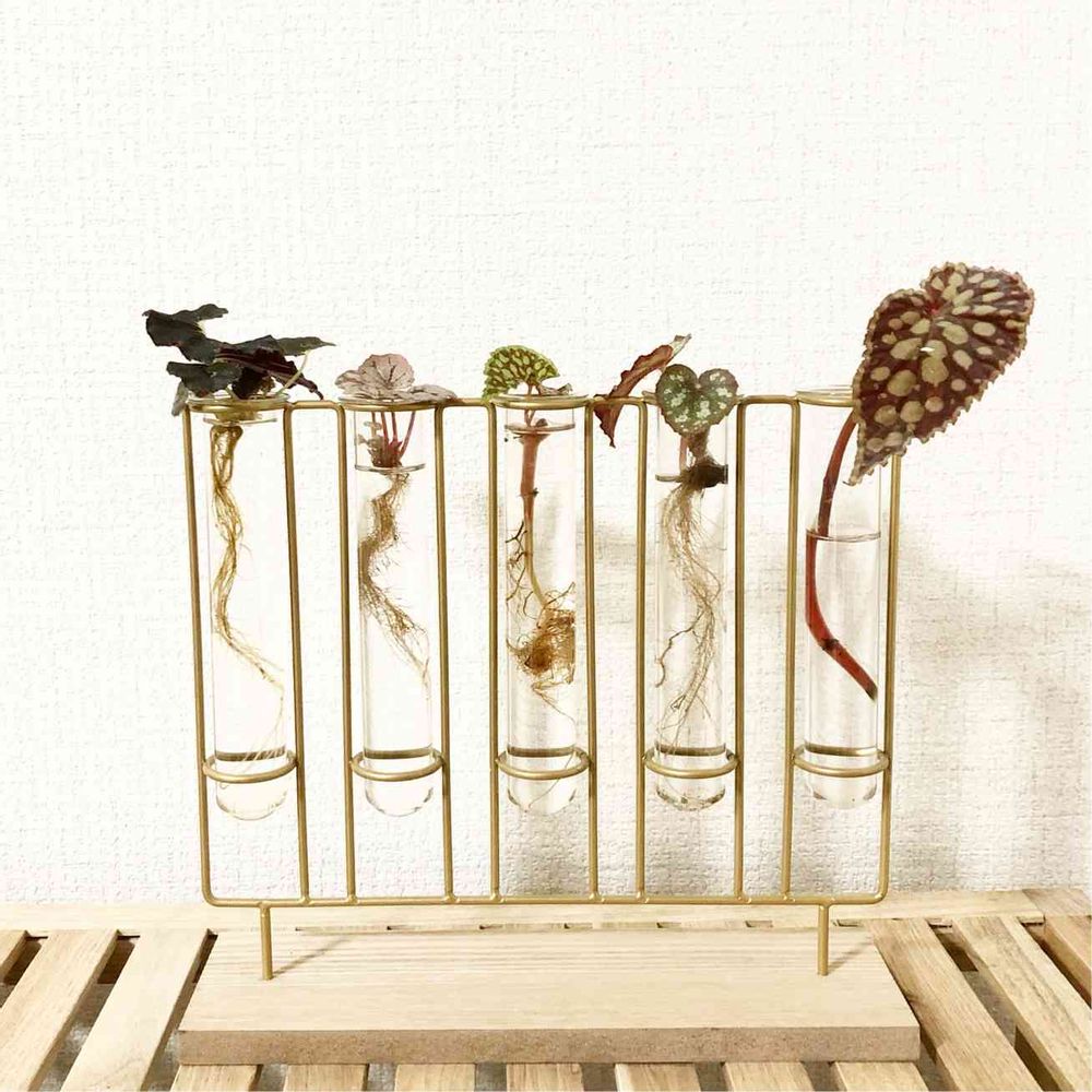 ニトリのフラワーラック/テストチューブとっても使いやすいです、一番右のクロロスティクタも根が出てきました🌱