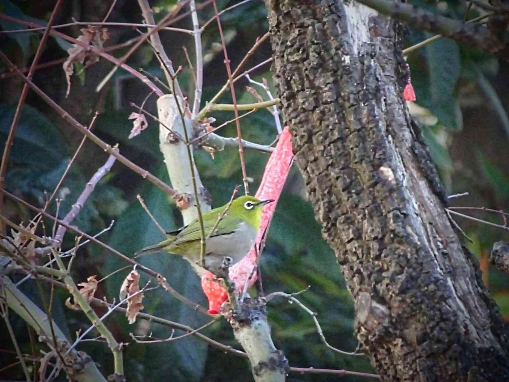 バードケーキをモミジの枝に下げたら、メジロがやって来ました!
