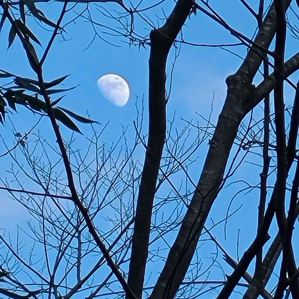 素敵に撮られた冬枯れの木立越しの月で、