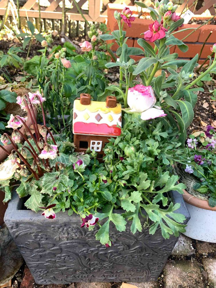 去年作ったのになかなか全体像が撮れなかった陶器の家オブジェを使った寄せ植え