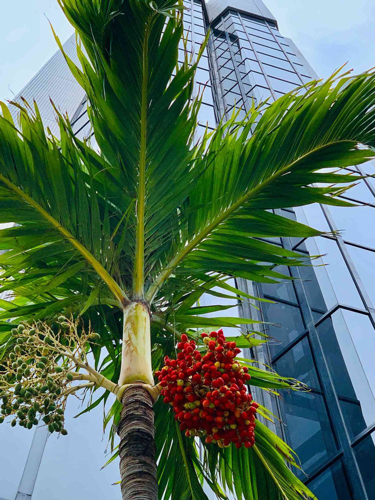 他の方々も仰られていますが、綺麗なビルと美しいマニラヤシの相性も最高で、超絶格好良いですね😆マニラヤシの果実は12〜1月頃に熟成すると赤色(光沢を有する鮮深紅色)に変化するらしいので、左側の果実も何れ色付いてくるのかも知れませんね🌴🔴🌴