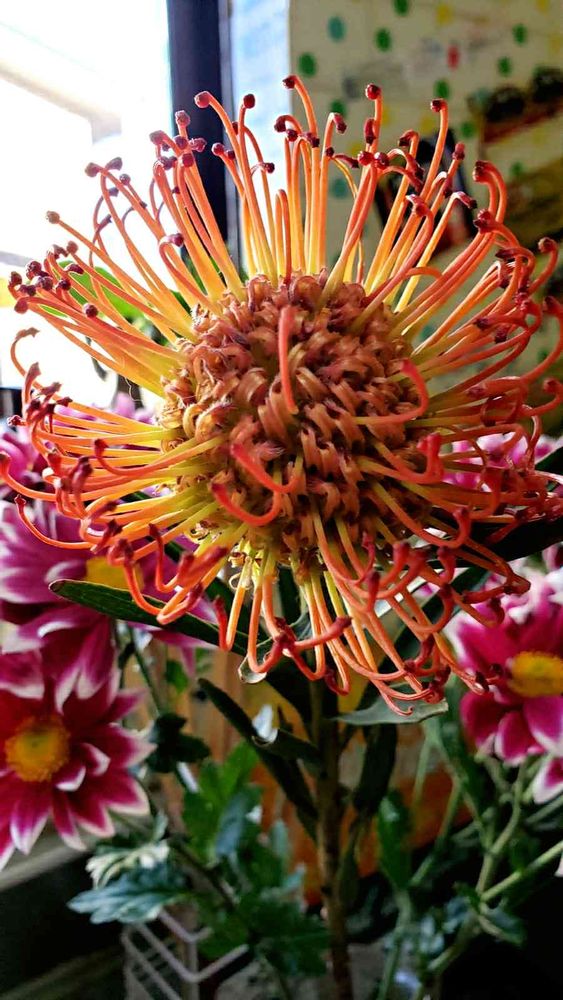花被から長い雄しべが出てて針刺しにたくさん針を