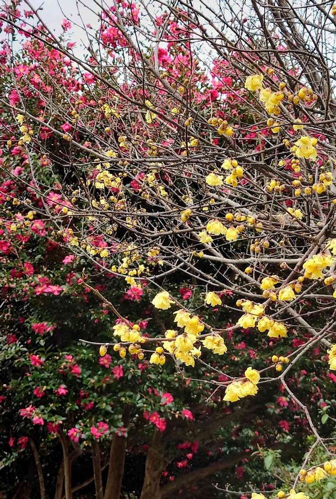 ロウバイと山茶花の 赤 黄の共演です❗☺️