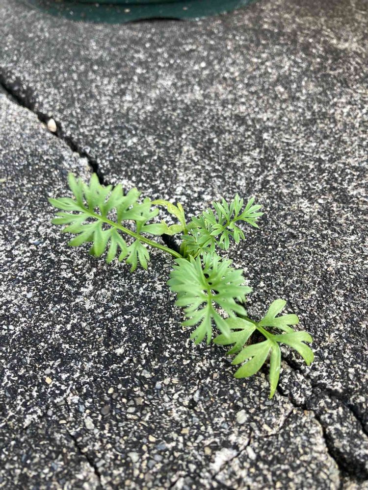 去年種まきして春咲いたニゲラのこぼれ種がコンクリートの割れ目に落ちたのでしょう。こんなところから生まれて冷たい風に揺れて頑張っています😊