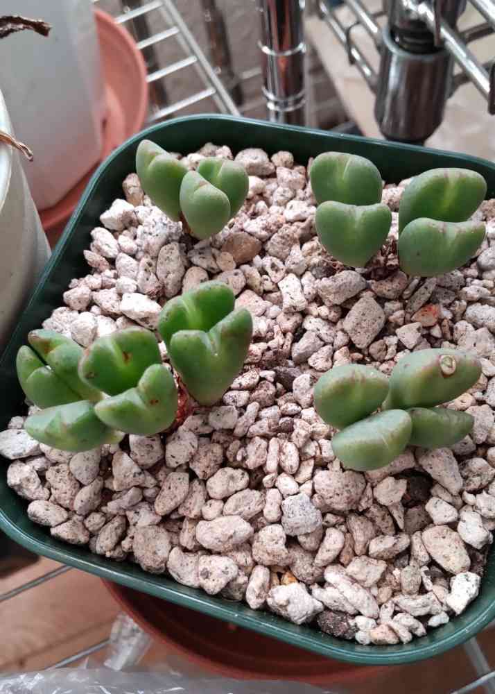 先日、一時寒さが緩んだ日に急いで植え替えたコノフィツム属の"花園"。