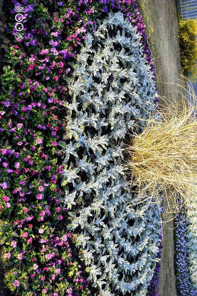 中央に枯れたススキを置き、周りをシロタエギクと紅色のパンジーを円形に配して、洒落た面白い☺造りになってます。