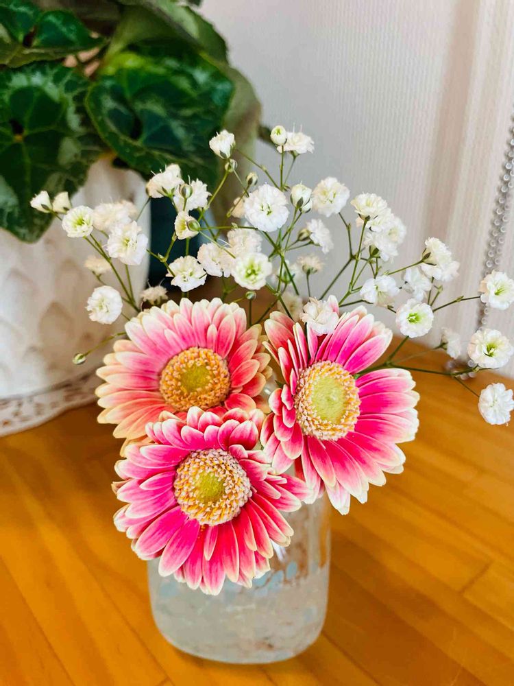 ガーベラの花言葉は希望。かすみ草の花言葉は無垢の愛、幸福、感謝。