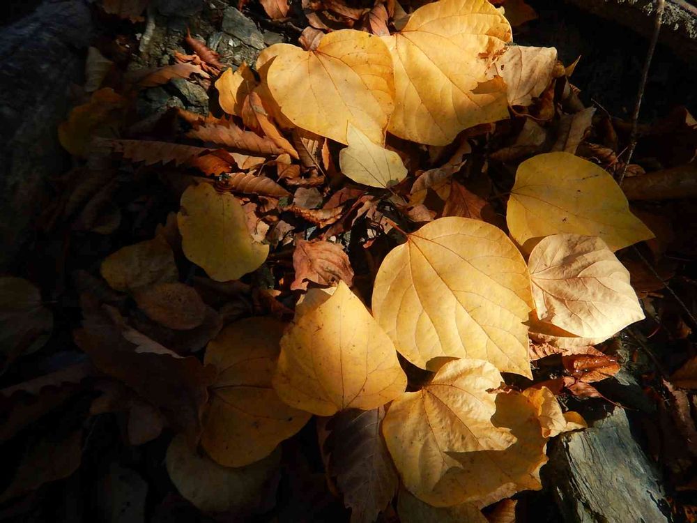 朝日が射すと、林床の落ち葉が浮かび上がる