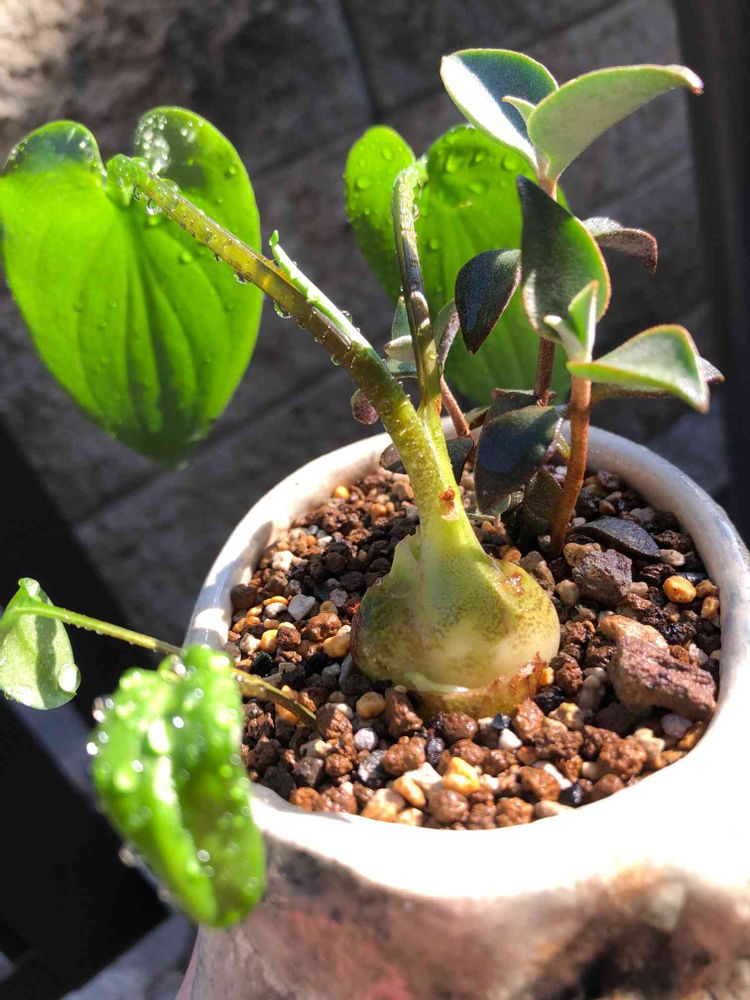 なんとなく、イモっぽい葉に新芽の出方がクワズイモ系だったり?🙄球根できるらしいですよ
