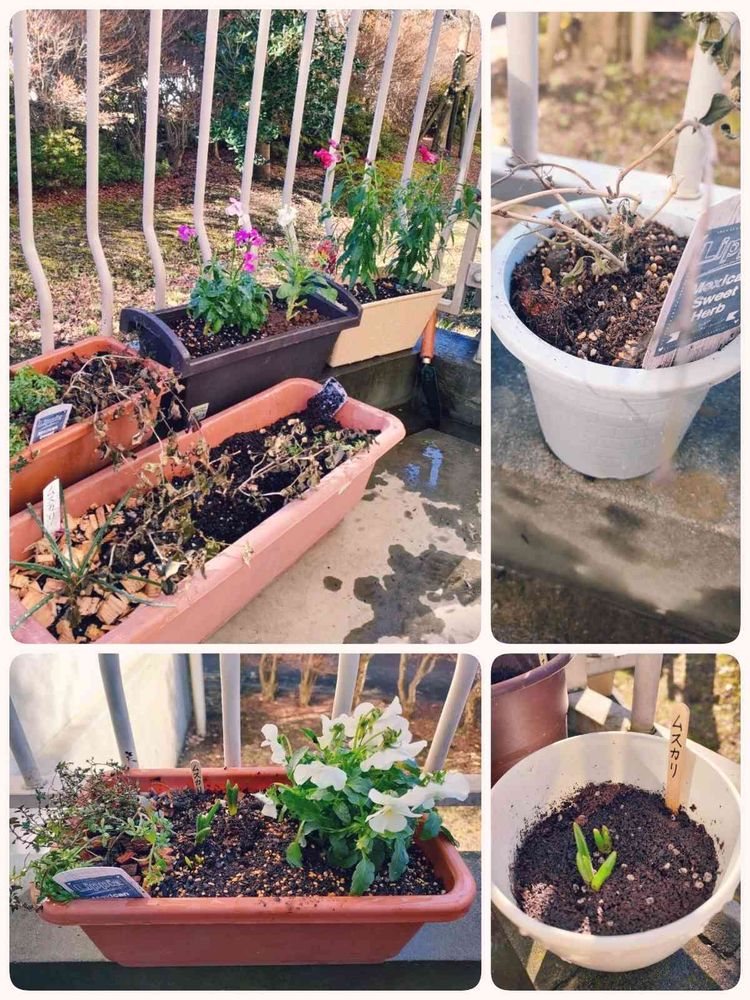 タイムの隣にムスカリ移植、そして白いビオラを寄植え♡ ベランダの隅に置くので敢えて大好きなビオラを(*˘︶˘*).。.:*♡ムスカリうまく根付くかな〜・ω・白と青のコントラストが楽しみ