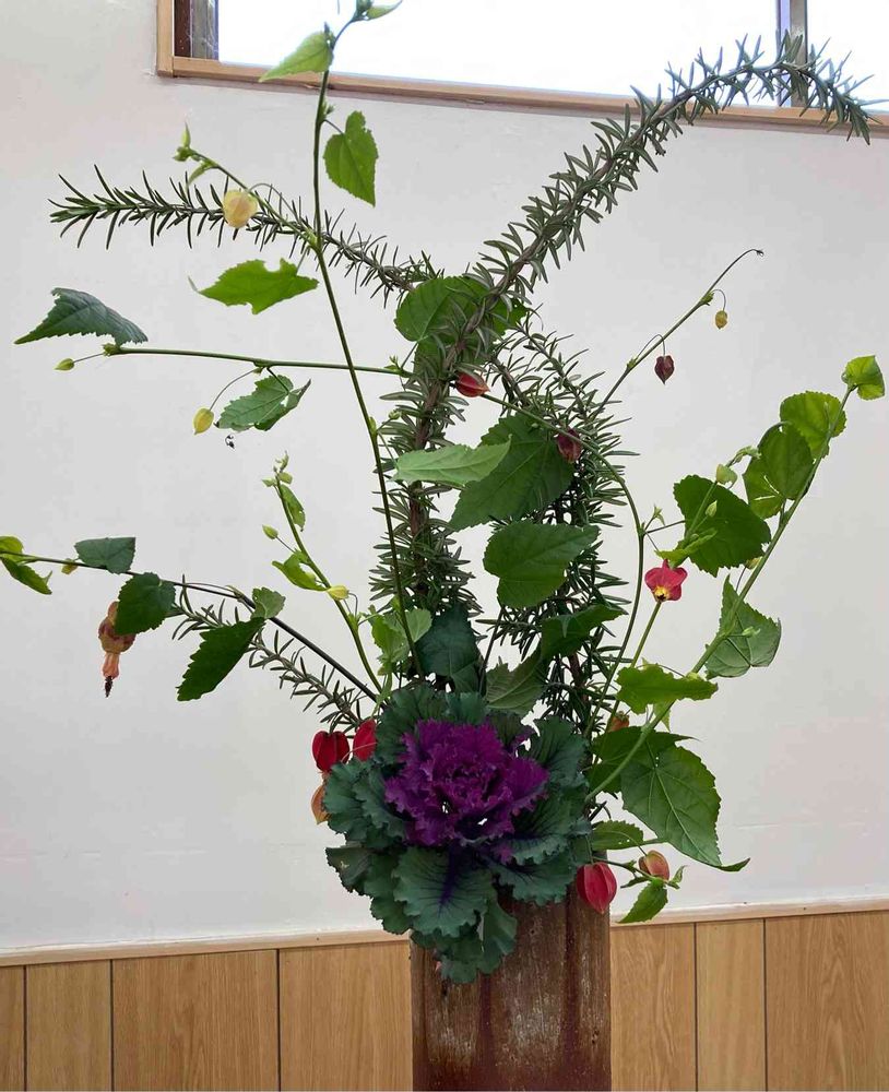 アブチロンが枯れて来たので、久しぶりに活けてみました‼️伸び過ぎたローズマリーと葉牡丹もこの際スッキリと剪定‼️腕は無いけれど、枝に動きがあるので、良い感じになりました🙆♀️