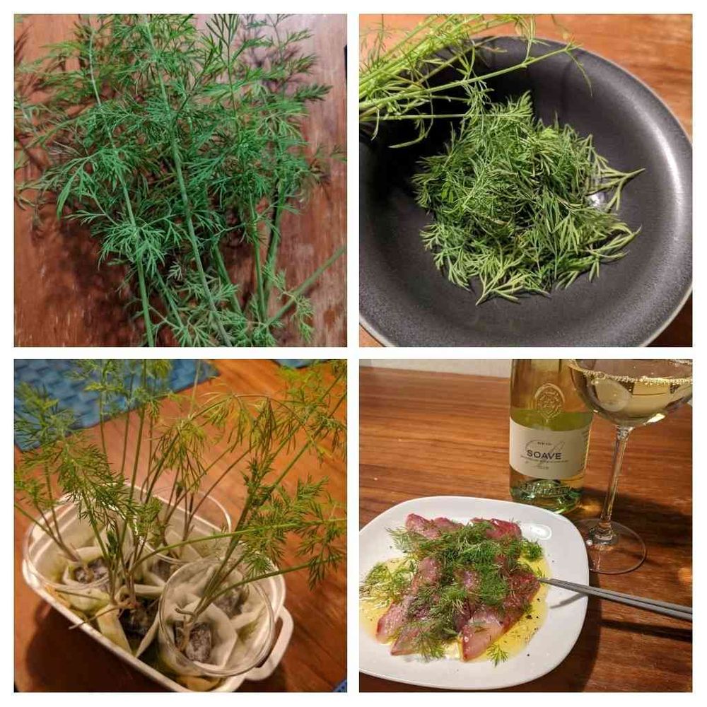 水耕栽培で種から育てているディルをたっぷり摘んでブリのカルパッチョに。
