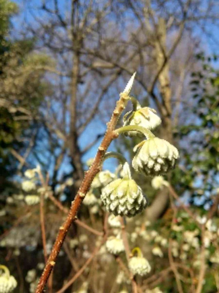 ミツマタの花は、黄色い花か、朱色の花(アカバナミツマタ)か、この白いミツマタの蕾は何色の花かな。