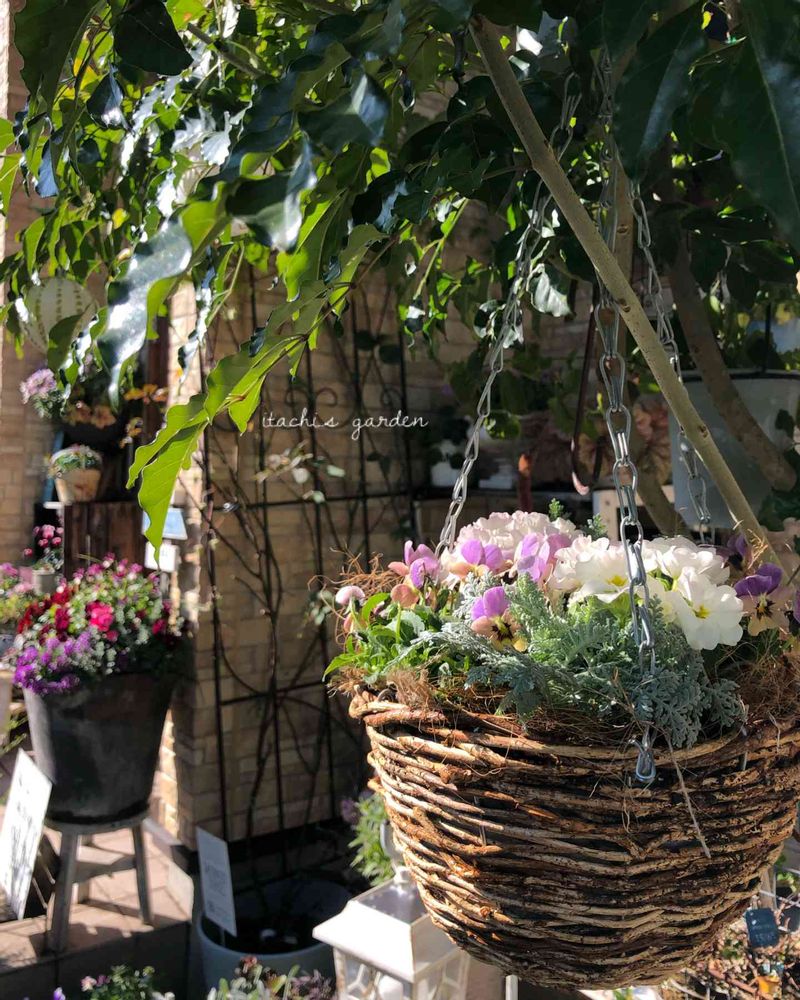 部屋の中でフリーになっていたハンギングの籠に、ジュリアンラヴィスと見元ビオラ、シルバーレースを寄せました💕
