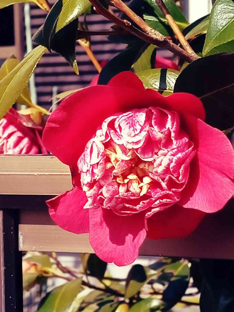 買い物帰りに、通り道のお庭の赤い卜半椿が、挨拶している様に、撮って下さい…と言っているみたいで、直ぐに🤳しました。