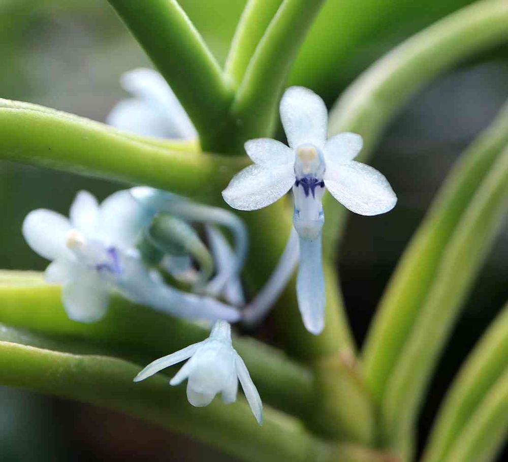 「ボルネオの青い蘭」とも呼ばれ、青くて細長い花を密集して咲かせる。