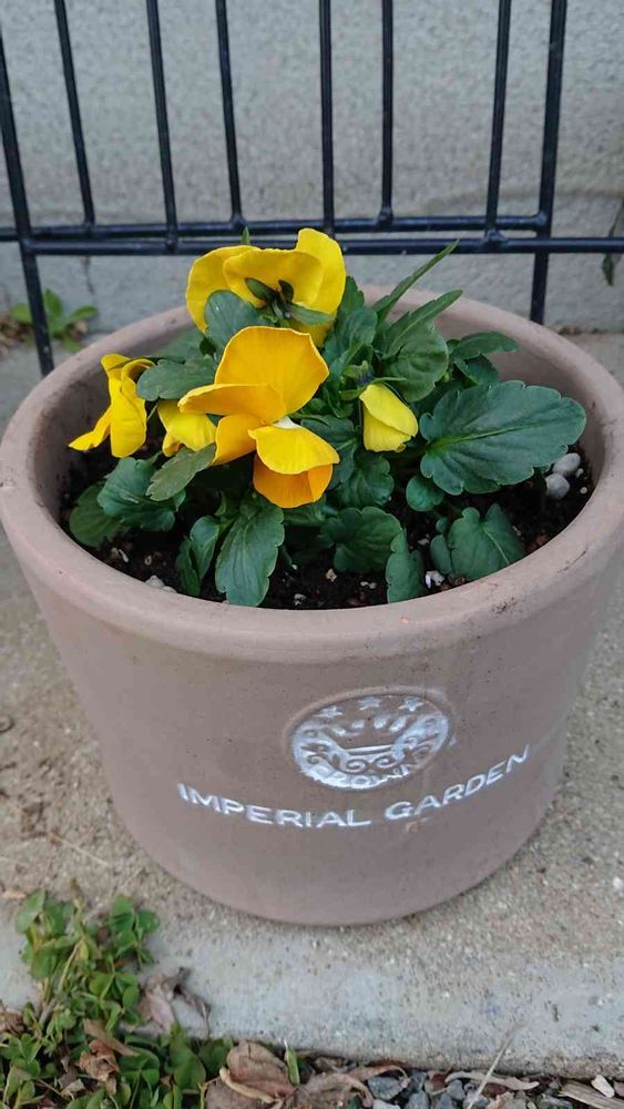 🌺種蒔きビオラ最後のポットは玄関用に、ひげ無しの山吹色を。
