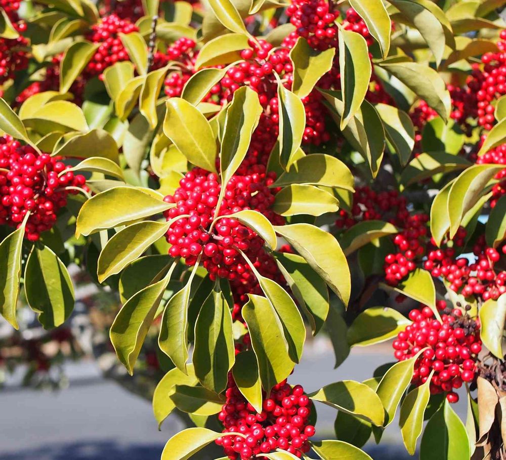 雌雄異株のため雌株だけ果実がつき、11 - 2月に真っ赤に熟して春まで枝に残る。