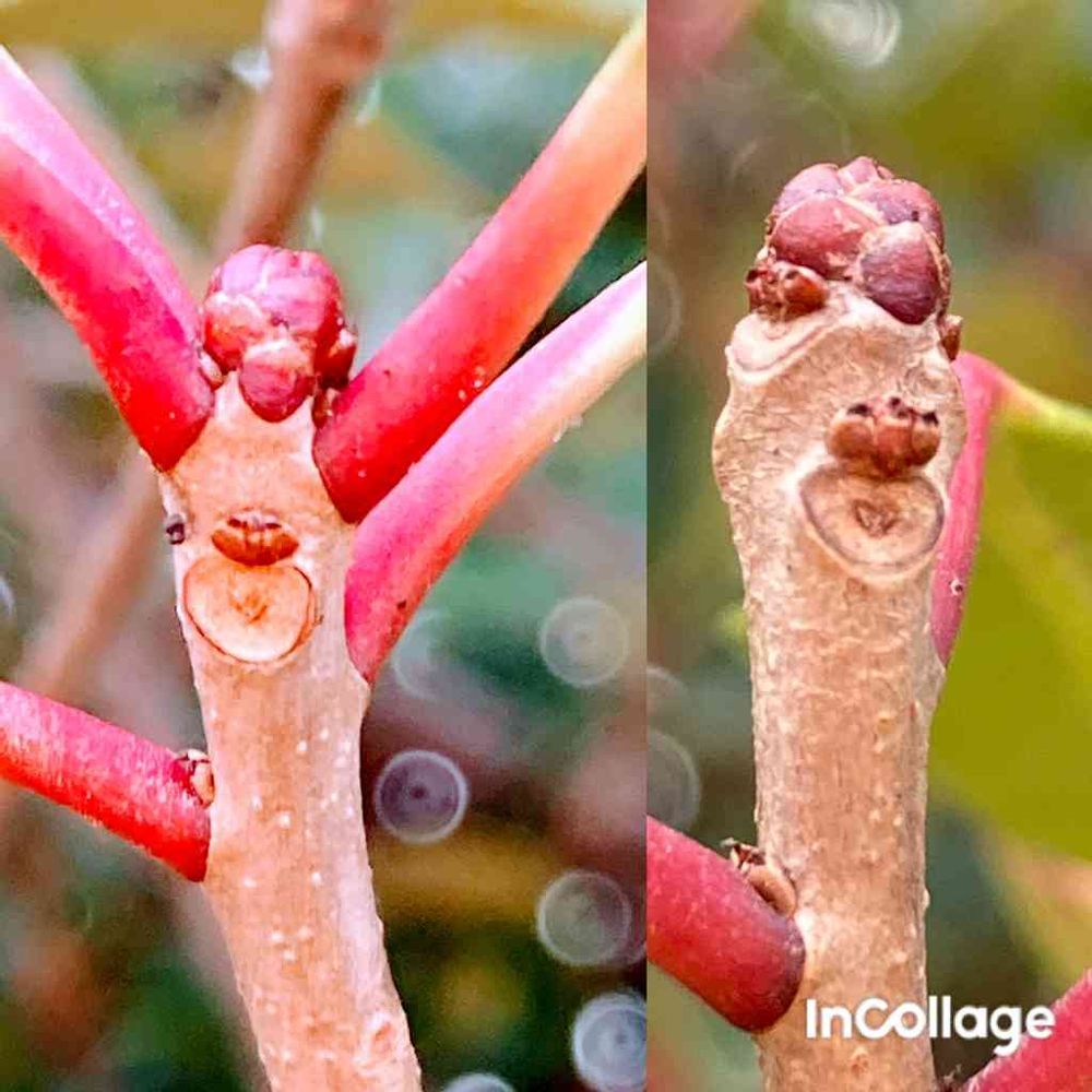 こんなに楽しそうな紅い葉痕と冬芽が隠れているなんて❣️