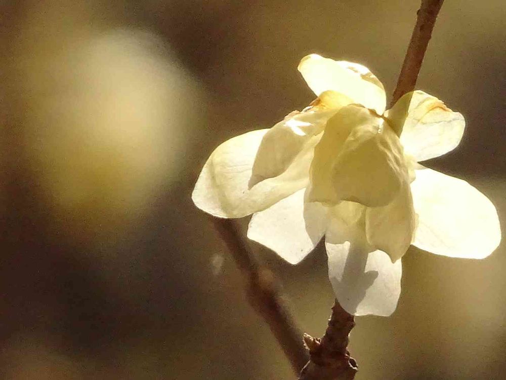 ロウバイ(蝋梅)、花弁には本物の蝋細工のような油を含んでいる。寒さや霜から身を守るための工夫なのだろうか。これが芳香の源で、シネオール、ボルネオール、リナロールなどの精油によるものだという。