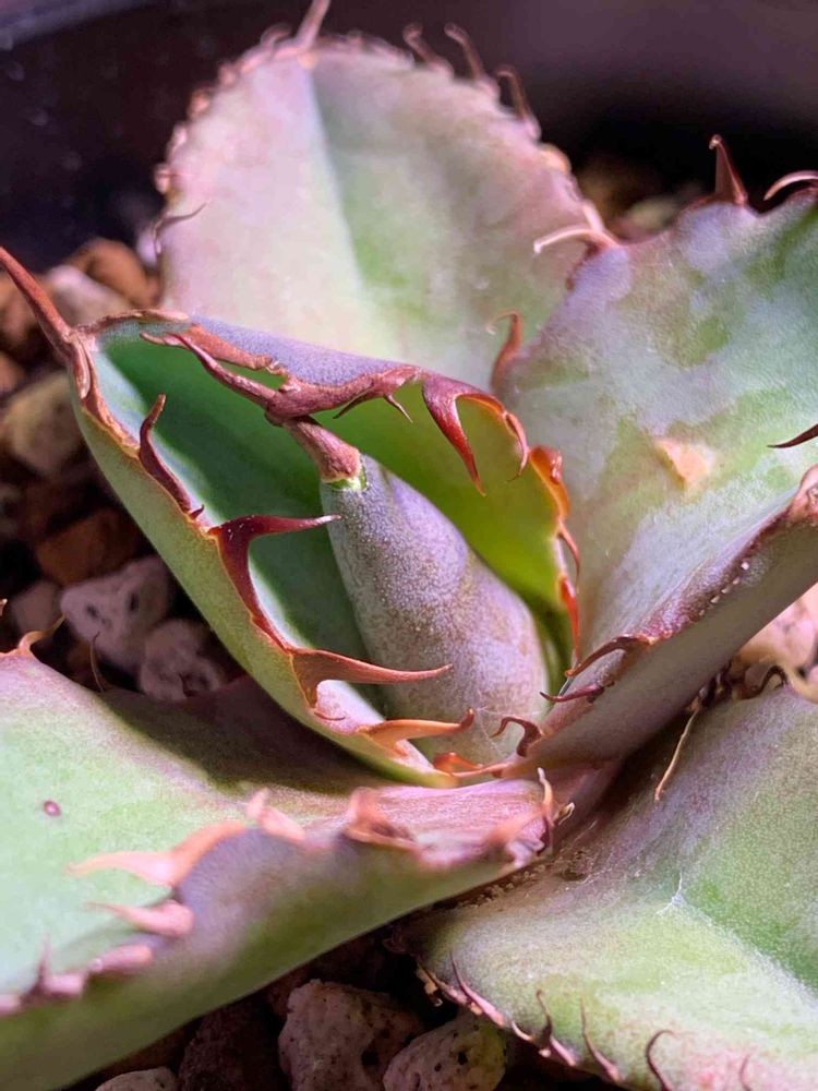 あー、チタノタのブラック&ブルーの成長点のトップスピンが折れてる。ずっと成長点の棘を抱え込んでて葉が開かないと思ってそのうち外れるだろ思ってたら。。。とげを一周くらい巻いて抱いてるから外れんわな。成長点の方が負けたか。あー、こういう棘だとこういうことあるんだな。お気に入りが、、、