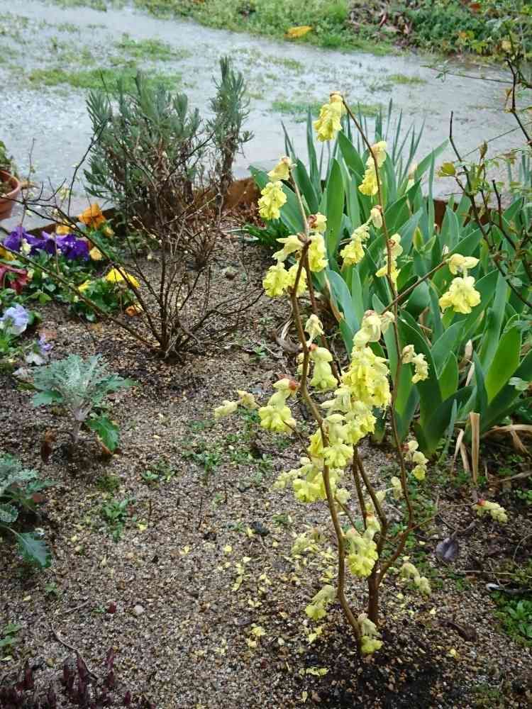今朝の庭。手前土佐みず木、奥日向みず木花咲き始め。今日も雨か・・・・( ̄O ̄;