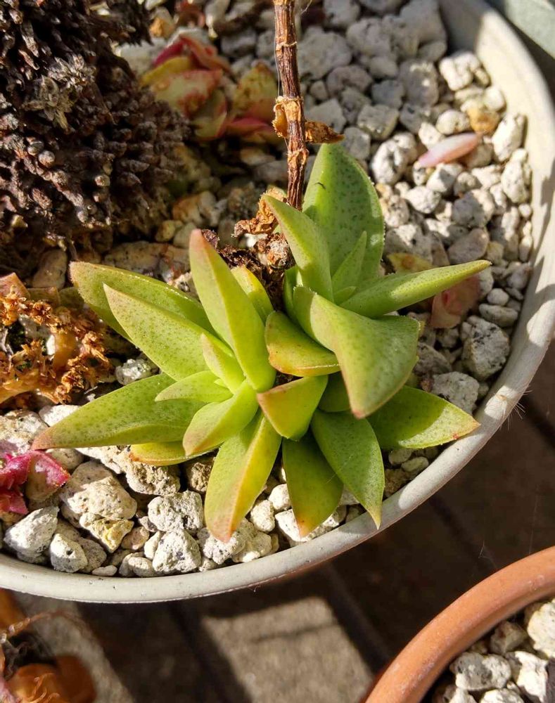 いい加減、鉢を処分しようかと思ったところ、棚の上段にいたクラッスラ属の"青鬼城(高千穂ともいう)"の花茎から葉が落ちて勝手に芽吹いているのを発見。