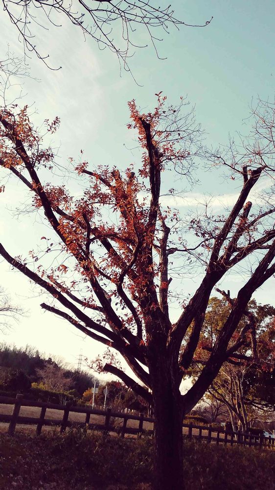 遅く出た日課のウオーキングの帰りは夕暮れとなり、夕日を受ける老樹に遭遇