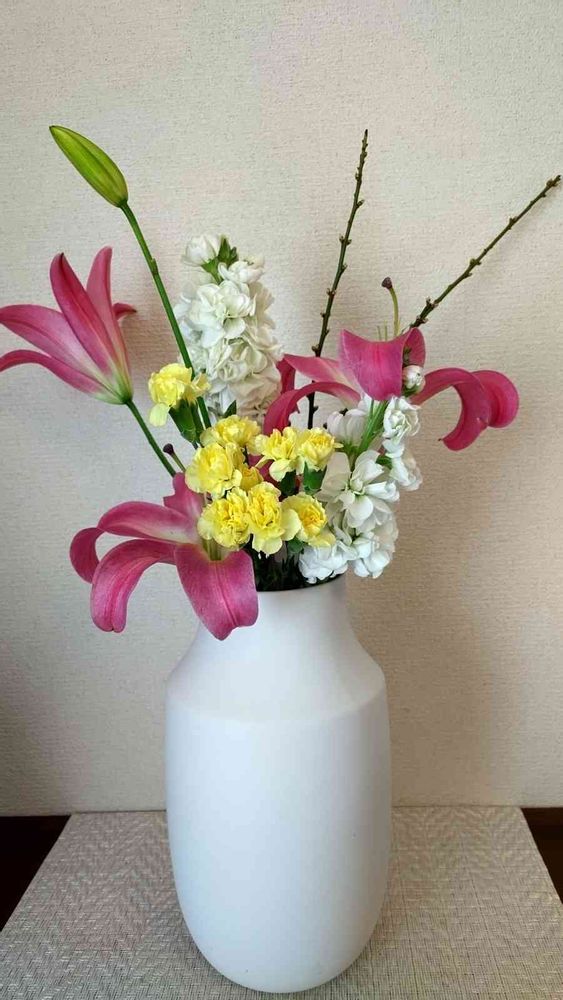 こちらのpicは先日の定期装花のオリエンタルリリーが次々に咲いてきましたので花瓶を変え花材もちょっと入れ替えました。ガーベラがやはりダメになってきたためスプレーカーネーションと梅の枝と入れ替えました。