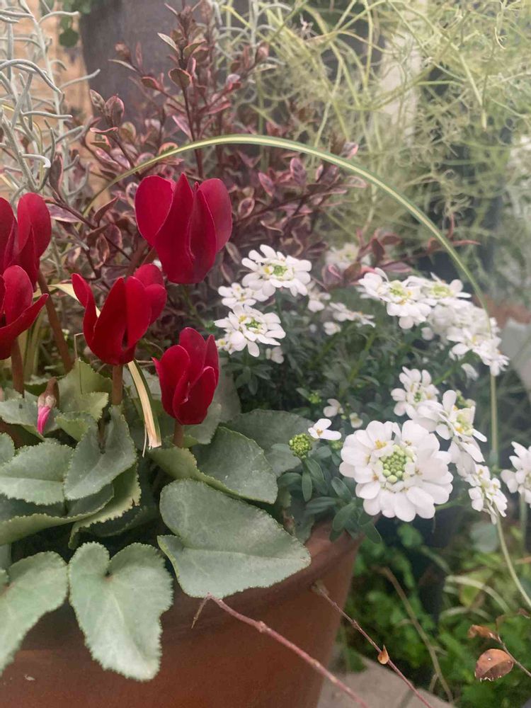 赤いシクラメンの隣りのイベリスがモリモリになってきました🥰