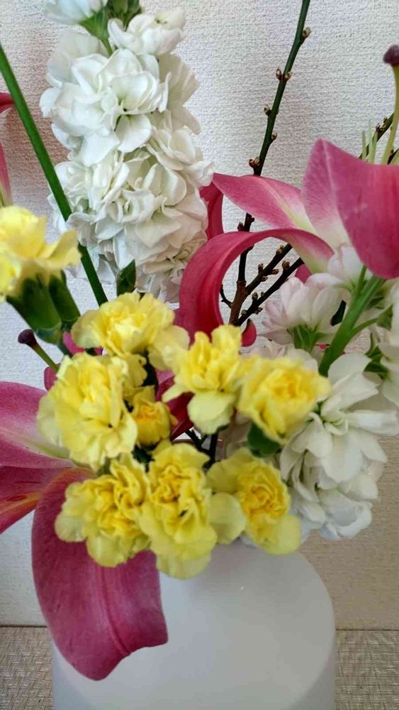 この写メは今朝のpicのアップ写メです。優しい黄色のスプレーカーネーションを中心に写メしてみました、、可憐なスプレーカーネーションとオリエンタルリリーとストックと梅の枝。