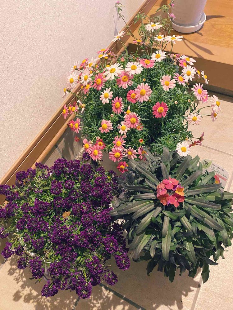 マーガレットもま〜るく咲いてて、かわいい😍🌸🌸🌸エリシマムも大株になって脇芽もすごいですよね💕葉っぱも元気だね〜(*Ü*)*.¸¸♪"