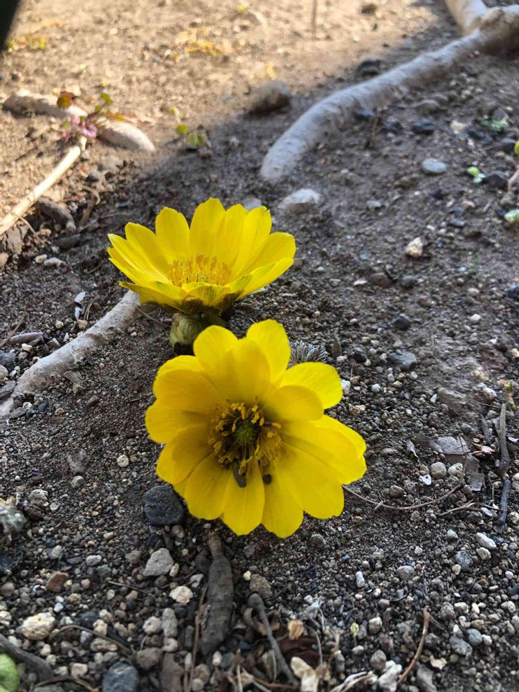 友達の家の庭に早春の福寿草が咲き始めていました。😊👍🎶
