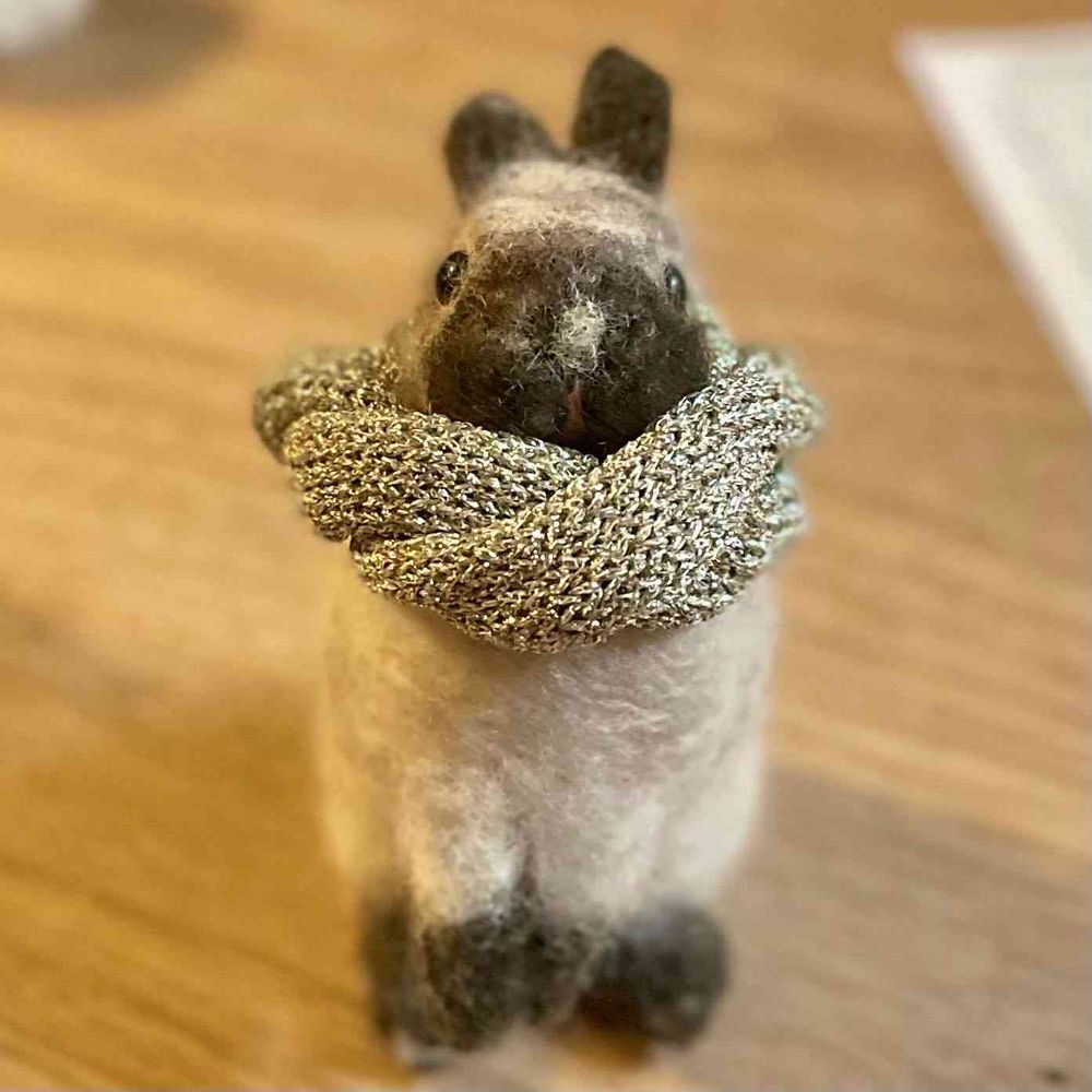 数年前に作ったものに、マフラーをつけてあげました。手のひらサイズの小さな🐰なんですよ。